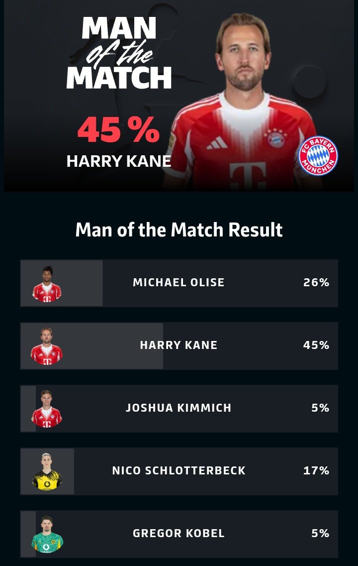 在今天凌晨进行的德甲第7轮比赛中,拜仁主场2-1击败多特,其中凯恩出战并打满全场,赛后,他以45%的得票率当选本场比赛全场最佳球员。
